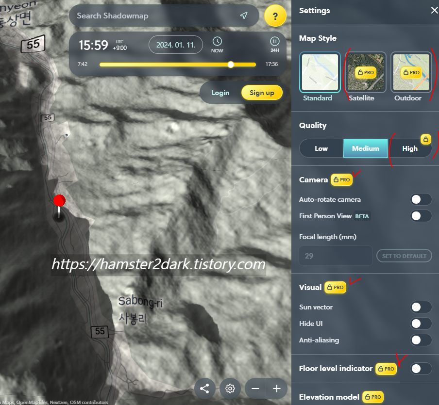 - 사용 이유 : 가입이 필요 없음 / 사이트로 간단하게 사용 가능 / 부분 무료(무료로도 충분함) / 시간대별 음영 확인 가능