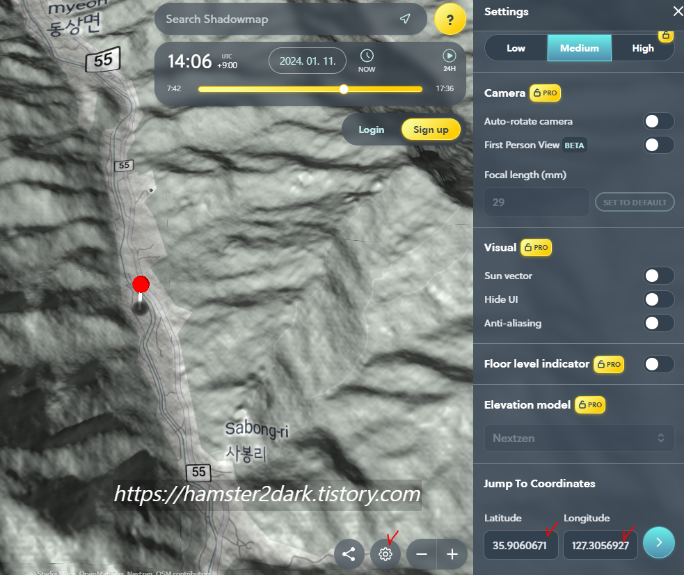 소개 사이트 보자마자 내가 원하는 거다. 원하는 좌표에서 시간대별로 그림자(음영)가 어떻게 지는지 확인 할 수 있습니다. 심지어 UI도 되게 간단해. 물론 다른 각도에서 보는 방법은 모르겠지만 대략적으로 확인하기 위해서는 이것만으로도 충분했습니다.(다른 각도는 유료일 수도)
