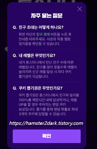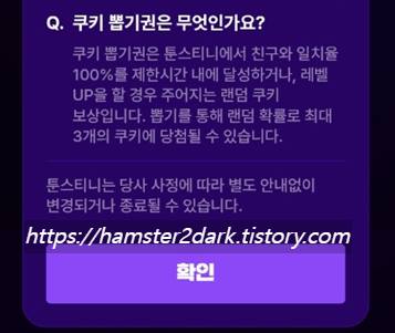 - 쿠키는 덤 : 일치율 100% 달성 또는 레벨 UP 시 쿠키 뽑기권을 받을 수 있어요.