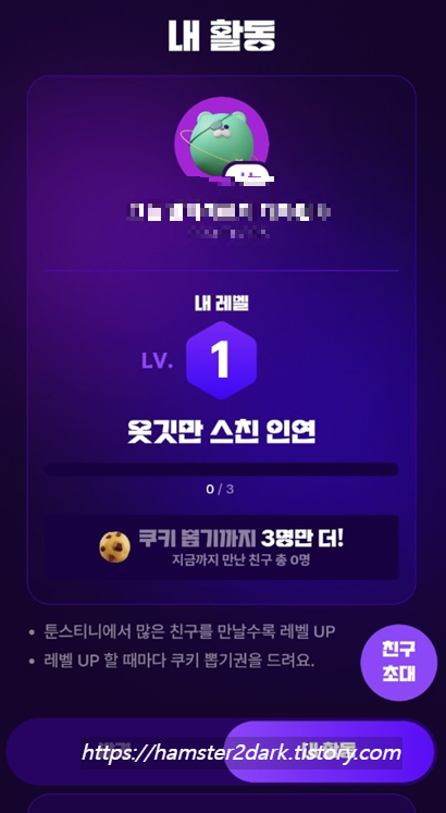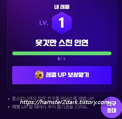 내가 툰스티니에서 만난 친구 수에 따른 레벨입니다. 친구를 많이 찾을수록 레벨이 높아지며 신규 레벨 달성 시 마다 쿠키 뽑기권이 지급됩니다.