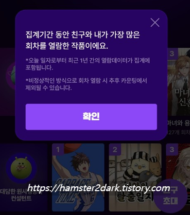 3개 회차 이상을 열람한 작품만 읽은 작품으로 카운팅됩니다. 다만 비정상적인 방식으로 회차 열람 시 추후 카운팅에서 제외될 수 있습니다. *오늘 일자로부터 최근 1년 간의 열람데이터가 집계에 포함됩니다.