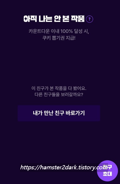 여기서 친구와 나의 일치율이 나오는데 100% 달성하면 쿠키뽑기권을 줍니다. 즉 매일 100% 달성하면 매일 쿠키뽑기권을 얻을 수 있다는 말인데요.