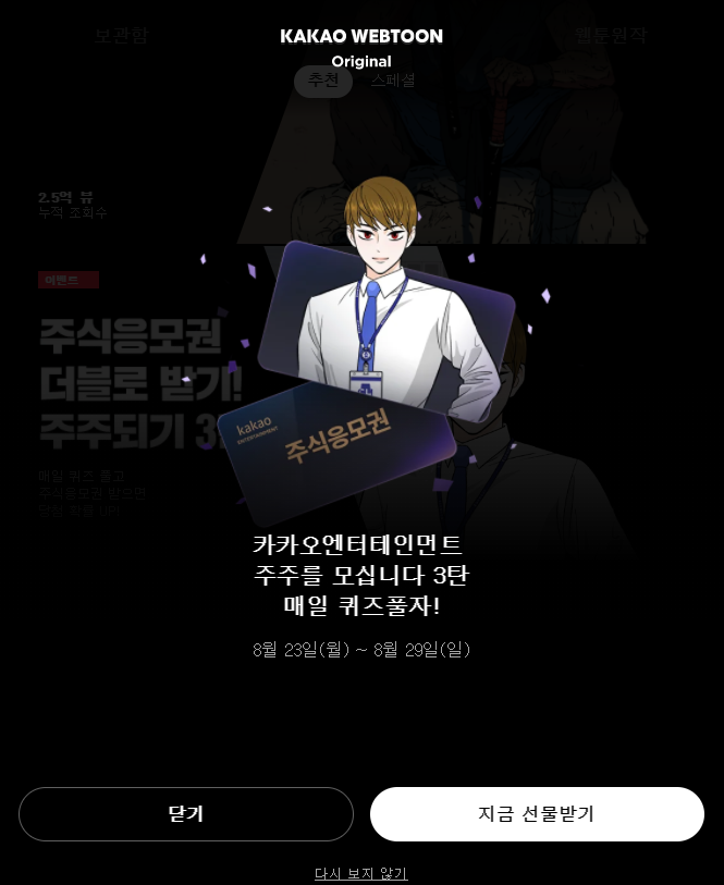 이번 주 8월 23일 월요일부터 카카오 엔터 주주되기 이벤트 3탄이 시작됐는데요.