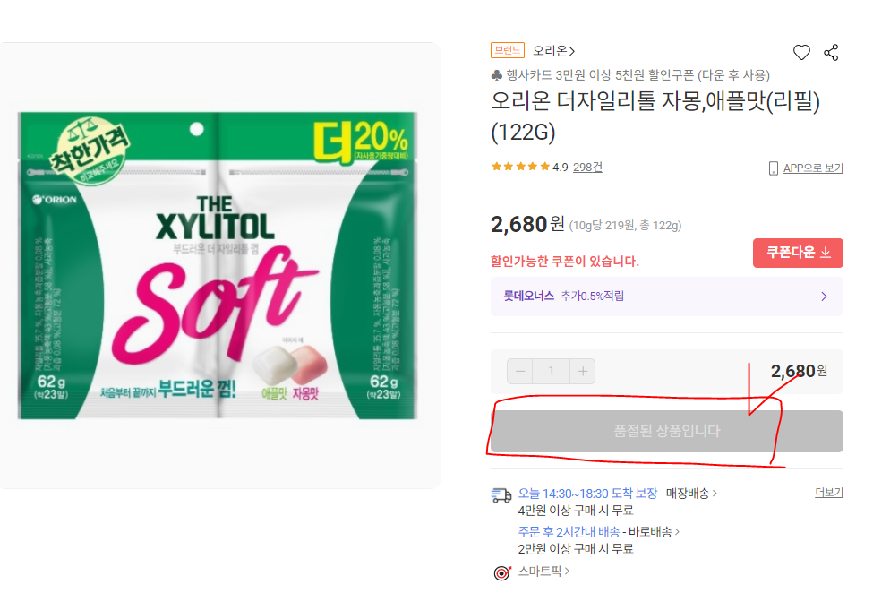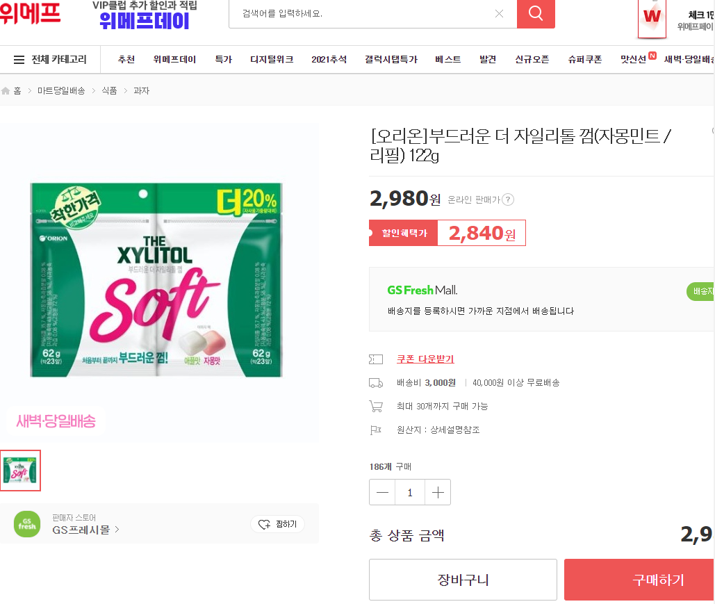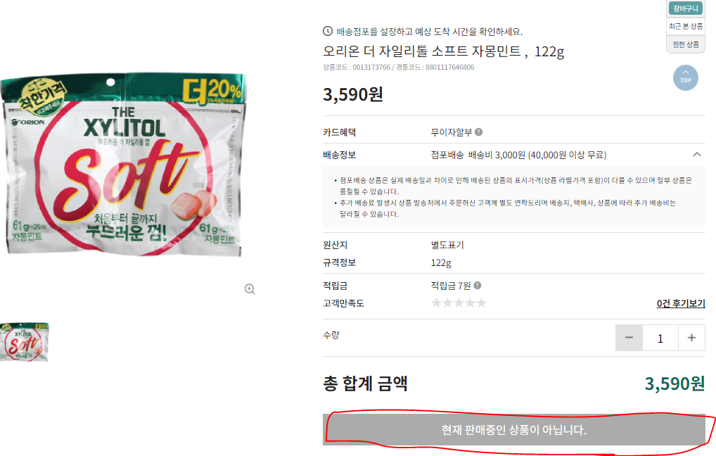 근데 배송비가 3000원... 껌 가격은 2980원... 배보다 배꼽이 큰 상황...