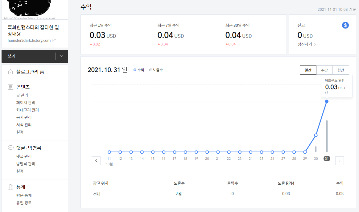 보통 애드센스 신청해놓으면 승인 안 나와도 '0원'이라고 뜨거든요.