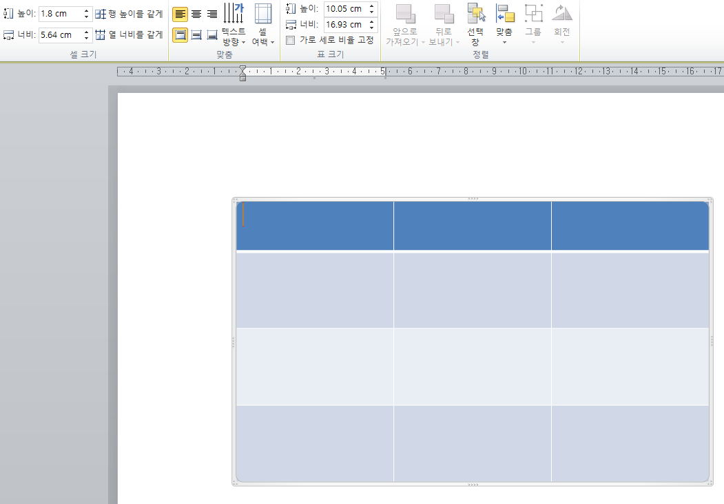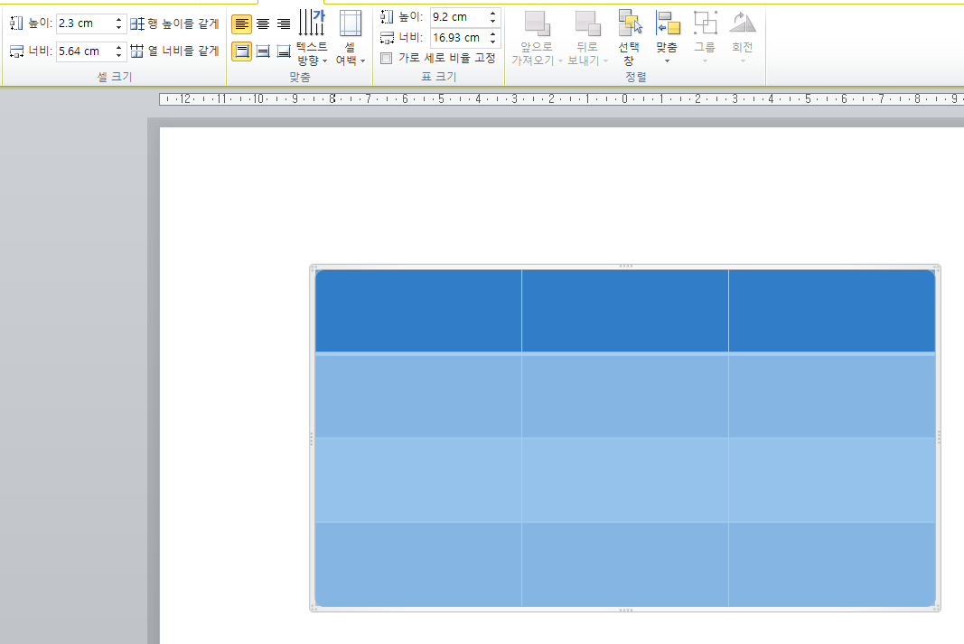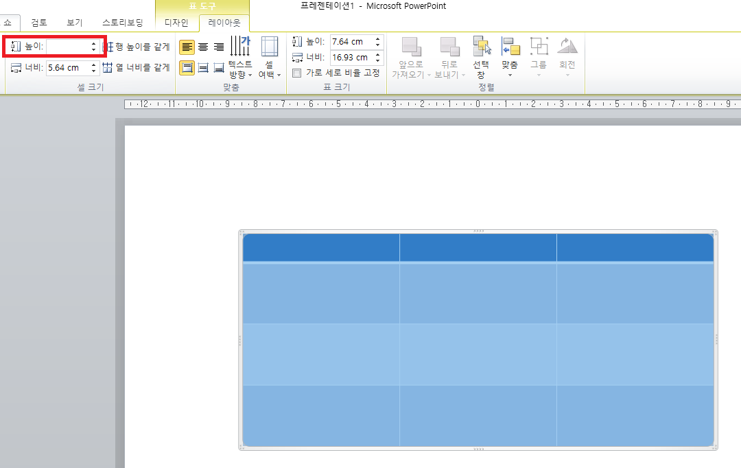이렇게 셀 크기가 일정하지 않은 셀들을 한꺼번에 드래그(또는 표 선택)해주시면 높이(현재 높이가 일정하지 않아서)가 공란이 뜹니다.